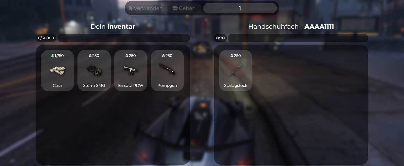 Kofferräume und Handschuhfächer besitzen die selbe UI wie das Inventar selbst. Dort könnt ihr alles von eurem Inventar direkt hineinziehen. Genau wie beim Inventar wird auch hier über den Slots angezeigt wie viel noch reinpasst und wie viel man insgesamt verstauen kann. Um den Kofferraum zu öffnen muss man sich einfach zum Kofferraum bewegen und sein Inventar mit "F2" öffnen. Um den Handschuhfach zu öffnen muss man sich ins Auto setzen und dann das Inventar über "F2" öffnen.