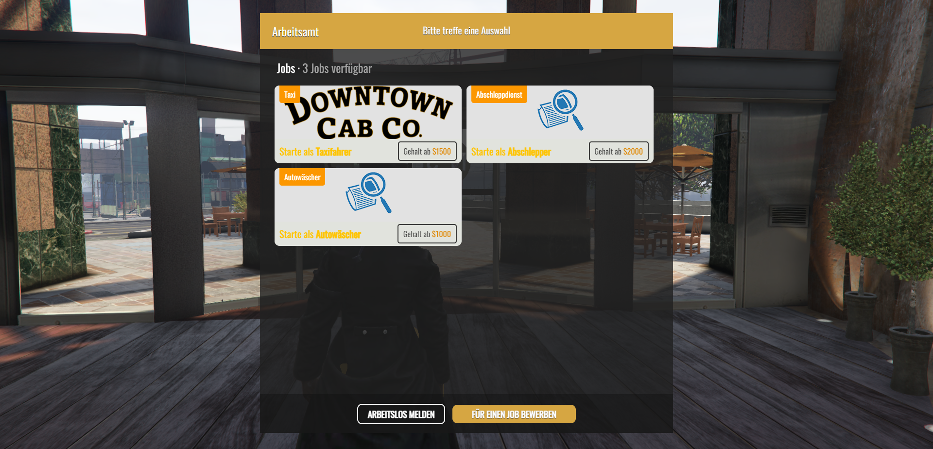 Im Jobcenter (PLZ: 382) kann man sich einmal arbeitslos melden und natürlich auch Jobs annehmen. Es sind zurzeit drei Jobs zur Auswahl. Der Taxifahrer, der Abschleppdienst und der Autowäscher bzw. die Autowäscherin. Die Jobs sind relativ lukrativ, da man schnell ohne großen Aufwand das doppelte oder dreifache (nur beim Taxi) verdient als, wenn man arbeitslos wäre.